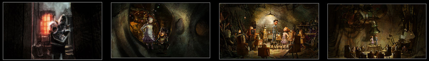 The following images are paintings I did for the color script, the purpose of which was to design the color, lighting, and mood for each of the sequences of the film. Most of these are based on storyboard drawings done by the story team, as well as some set design concept drawings by Michel Breton and Tom McClure. A few of them are photo-bash paintings made up of character, set and prop photos with painting on top.